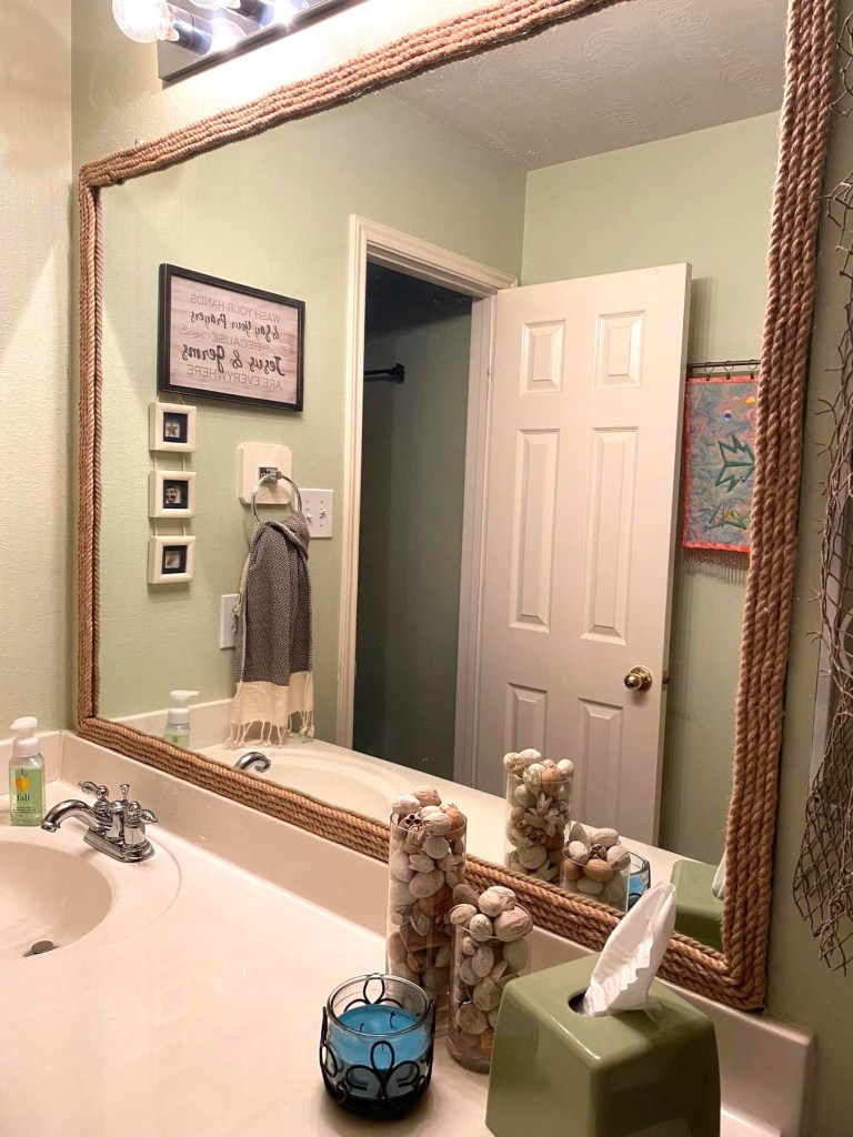 In each bathroom, over the vanity, I have those large frameless mirrors. They are great for seeing all you need to see, but they’re ugly. My grandmother Lucy would always decorate her mirrors with seashells, ribbons, jewels and paint to create a frame around those mirrors.
