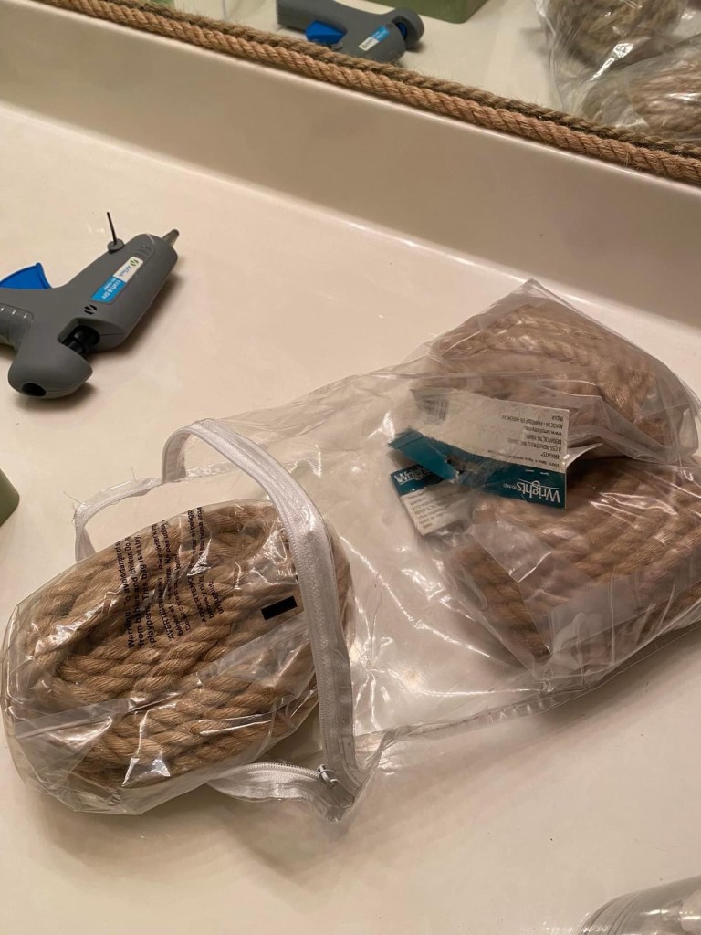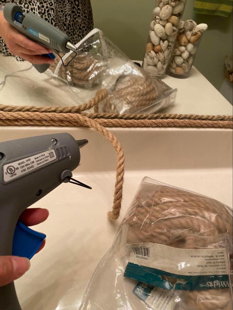 I measured around the mirrors times 4 to determine how much rope I would need to create a rope frame. I found the jute at Joann Fabrics.
