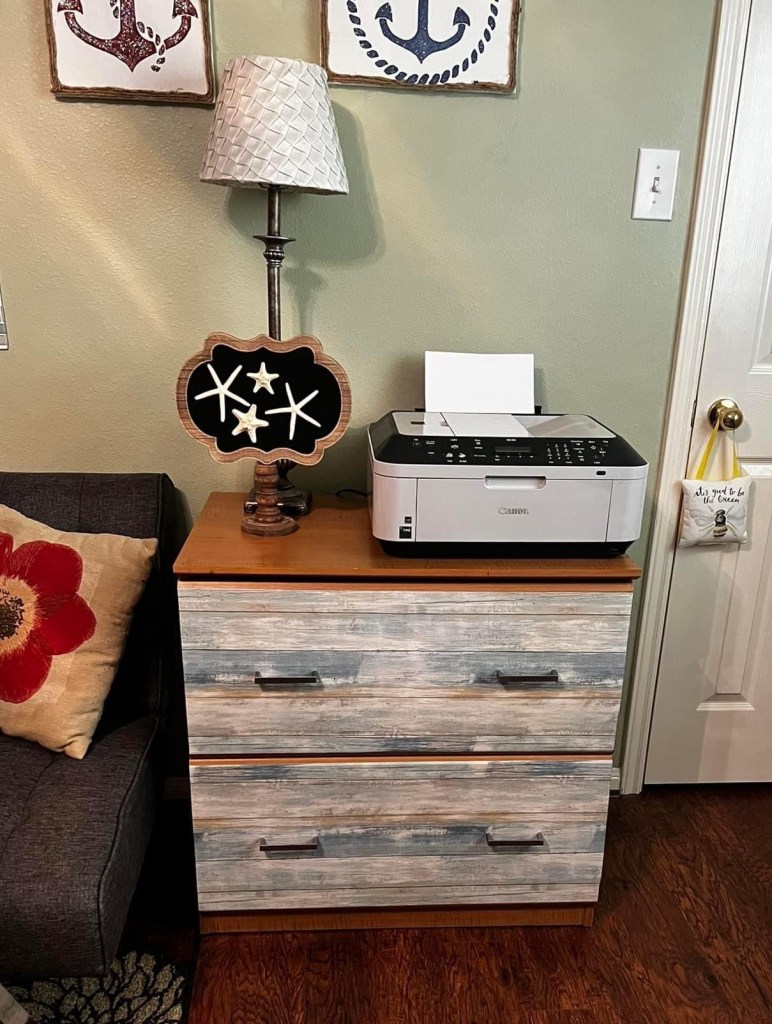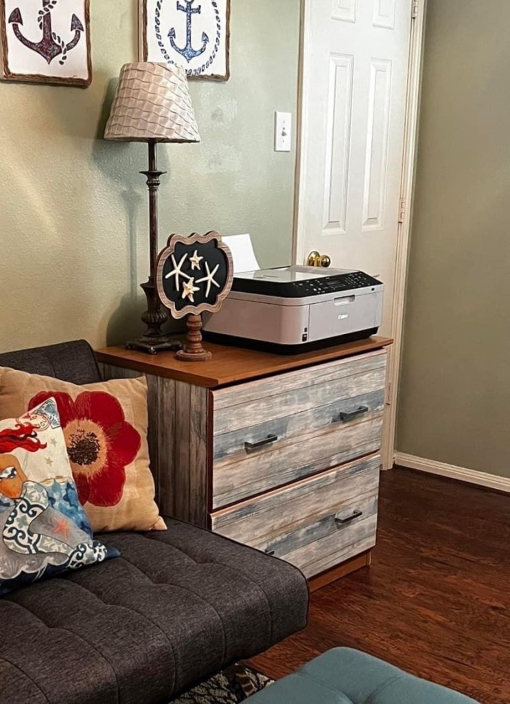 I have beach themed décor, so weathered wood wallpaper fits my home style perfectly. The nice thing about my wallpaper home hacks is that I can incorporate my weathered wood look throughout my home to tie the whole seaside affect together.