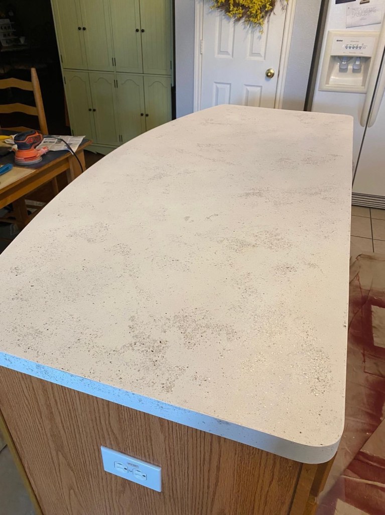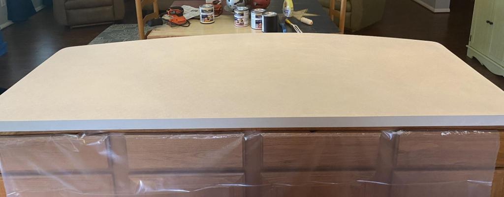 The steps were easier than I thought they would be. The refinishing kit came with everything I needed to do the job. I started by lightly sanding the laminate to scuff it up. Then I applied two coats of a primer paint from the kit using provided rollers.