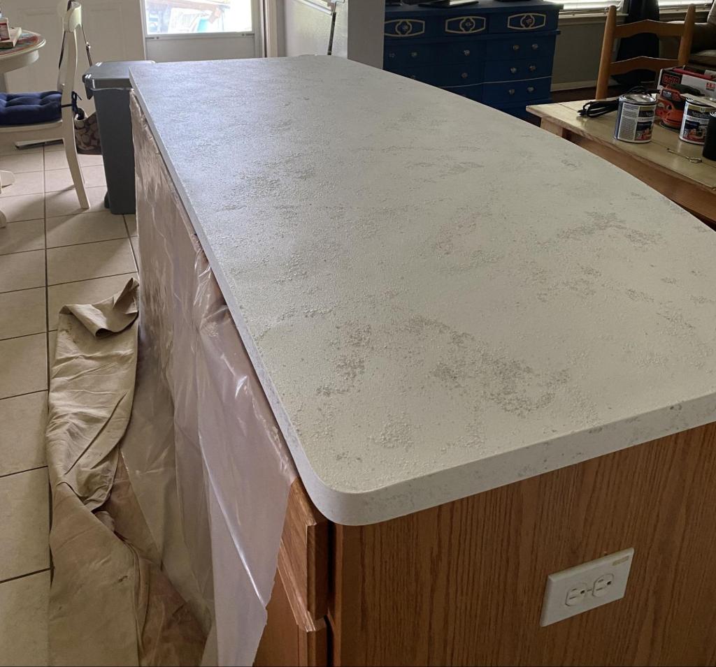 I started with the kitchen island. My countertops were a butcher block pattern laminate. I purchased the SpreadStone Countertop Refinish Kit by Daich for around $139 from Lowes. I did a little research first to see which would be the best for painting/refinishing countertops that were not a “stone” material.