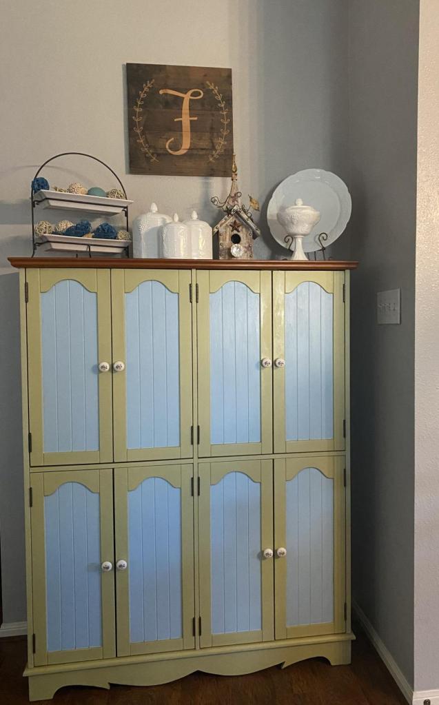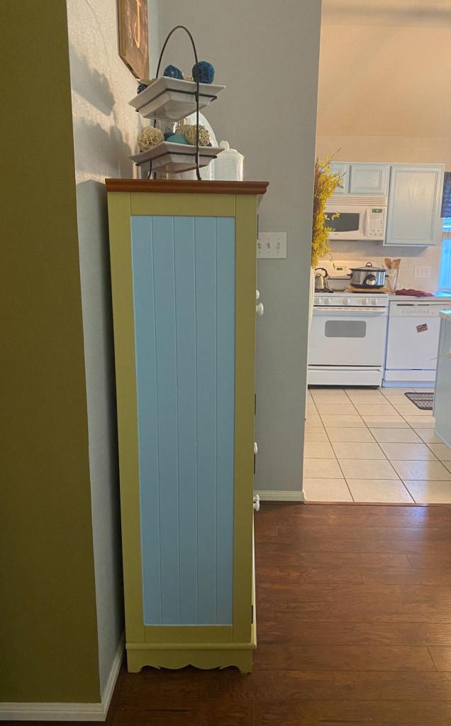 During my kitchen makeover, I decided to use some of the blue paint I used on my kitchen cabinets to refresh the free standing pantry cabinet.