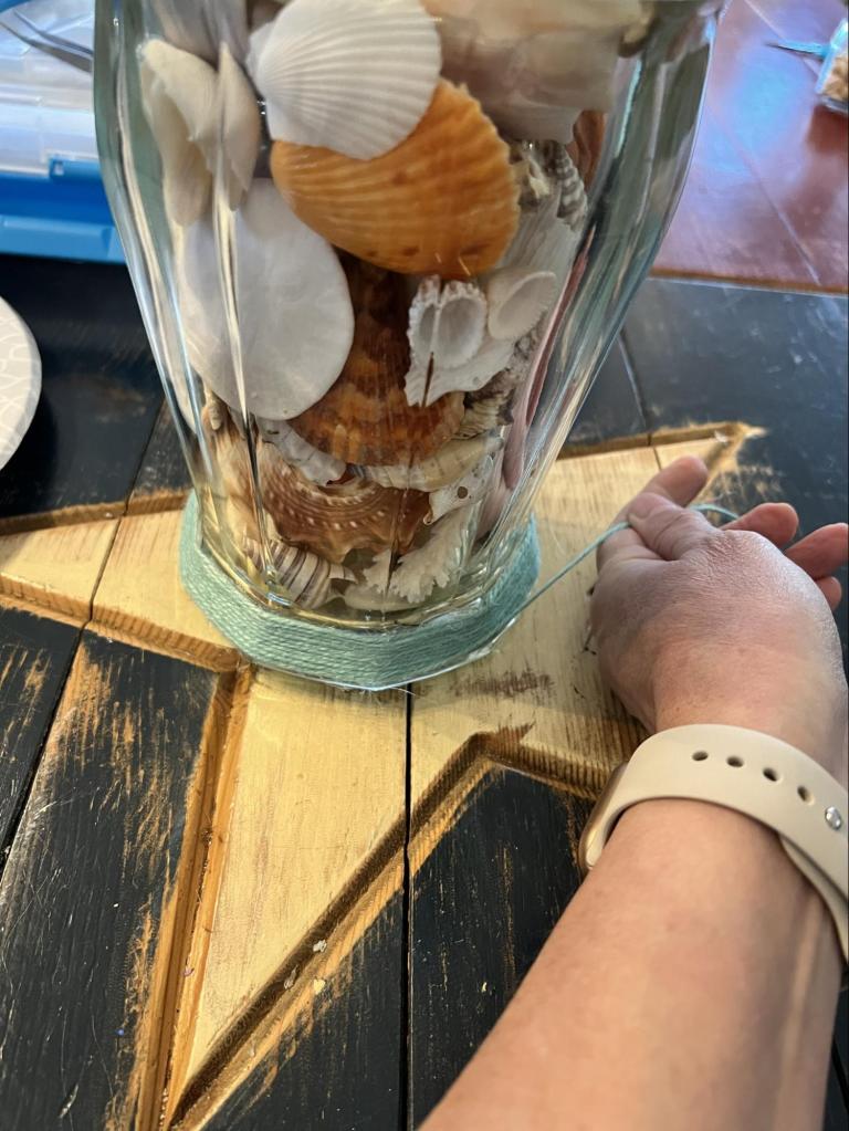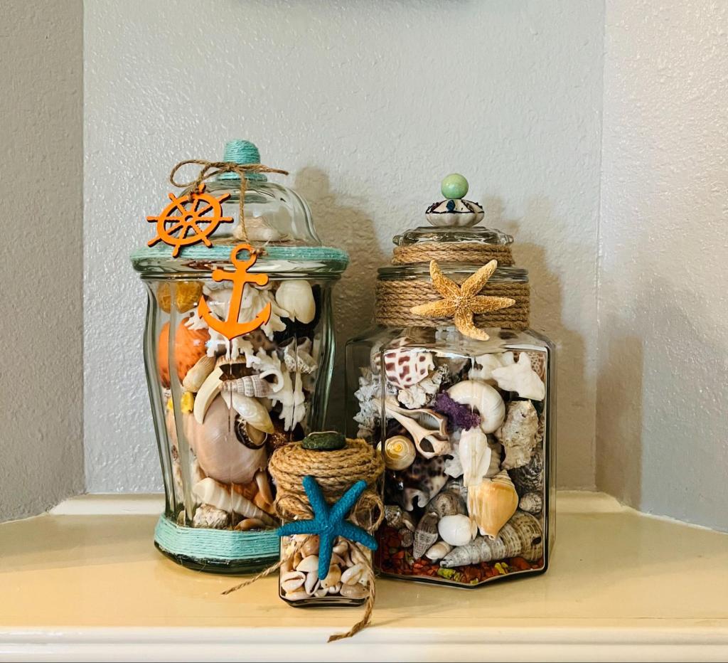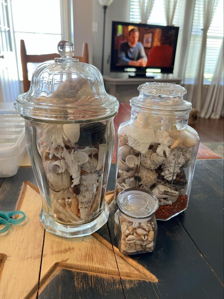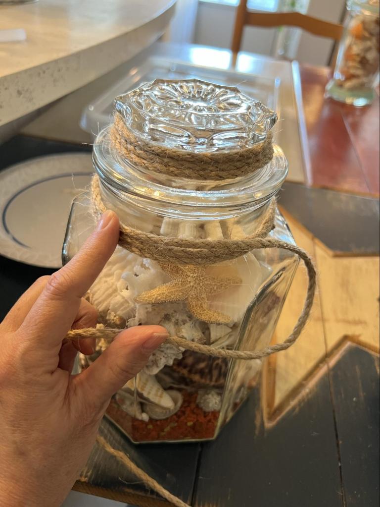 I love dressing up glass jars to display around the house. My mother gave me some seashells she had, and some were in jars that I remember seeing as a kid growing up. I am sure many were collected by my grandmother Lucy over the years, and I am so glad my mom held on to them.