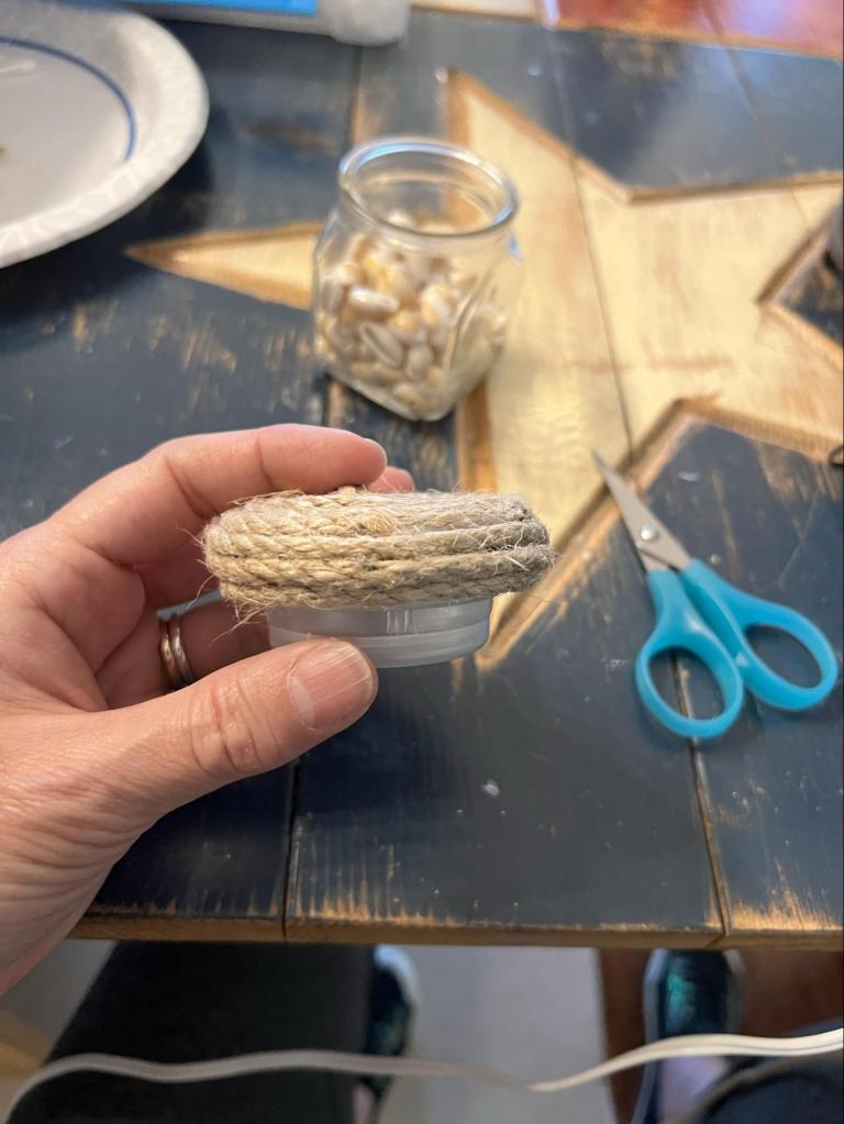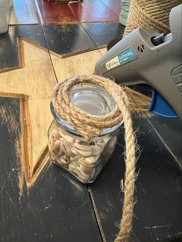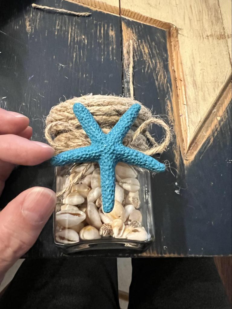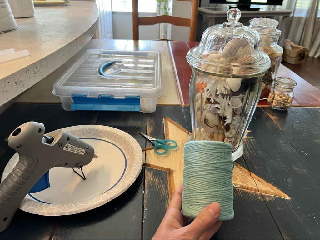 I am not into the plain jars, so I had to dressed them up! I pulled different jute ropes, along with a drawer knob, molded starfish, paint, wooden cutouts and some buttons and beads out of my craft stash.