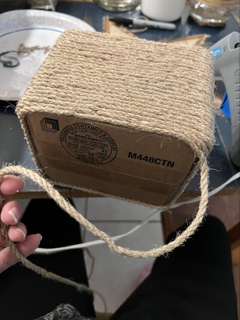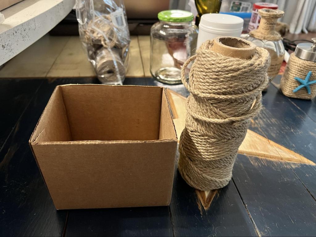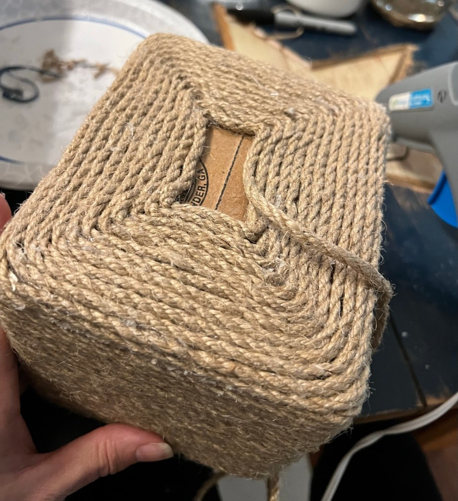 I started wrapping the box with jute twine using a glue gun.  I started at the top opening of the box and worked all the way down, covering the bottom as well.