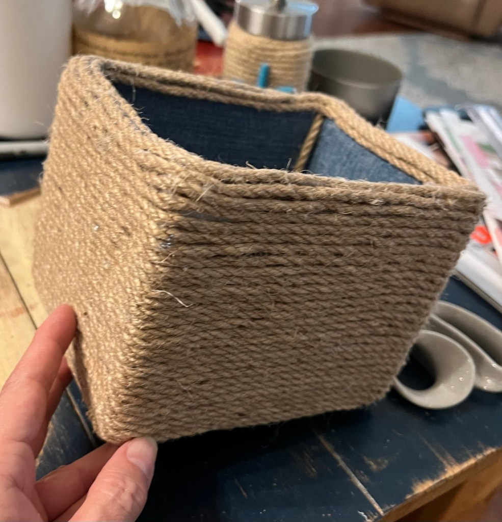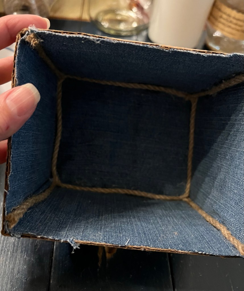 What would I do with a cute little cardboard box? Cover it in jute twine, add some denim fabric and give it a few embellishments. Another easy project using a hot glue gun and jute!