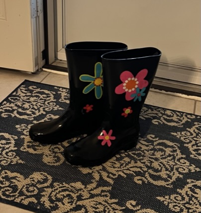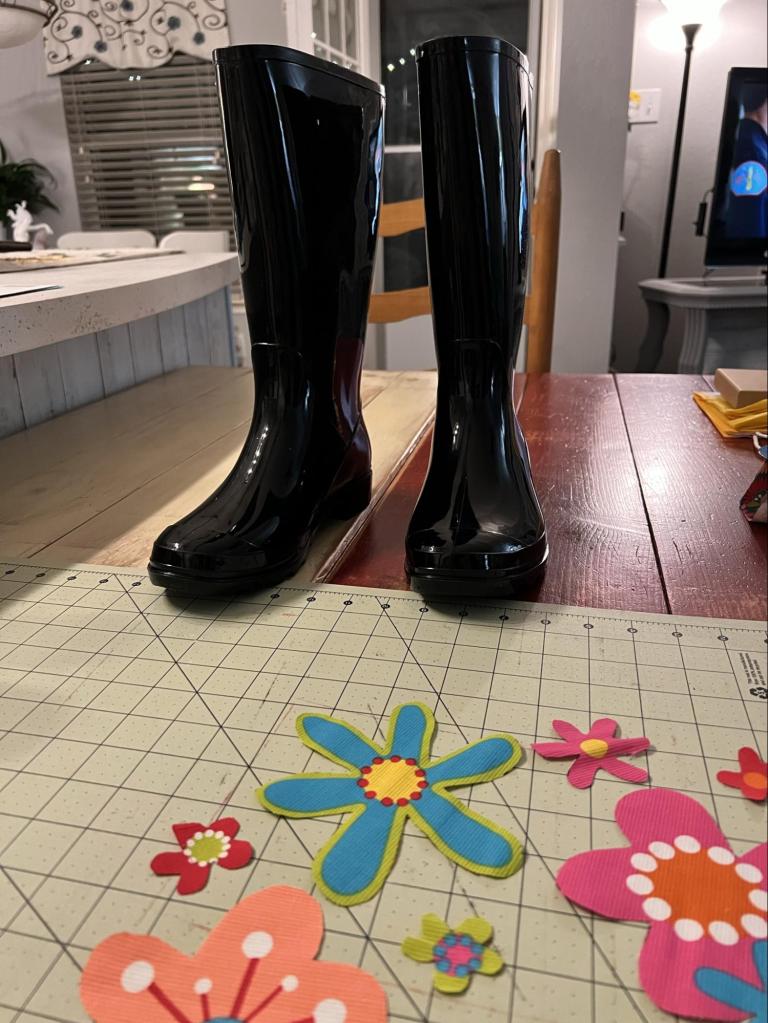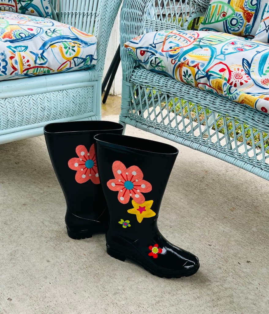 I recently purchased some cheap, basic black rubber boots from Walmart. I keep them at my back door for walking to the bird feeders in the backyard; especially after a rainy day. But I’m just like you. I want cute footwear, so I decided I would add a little flowery flare to dress them up.