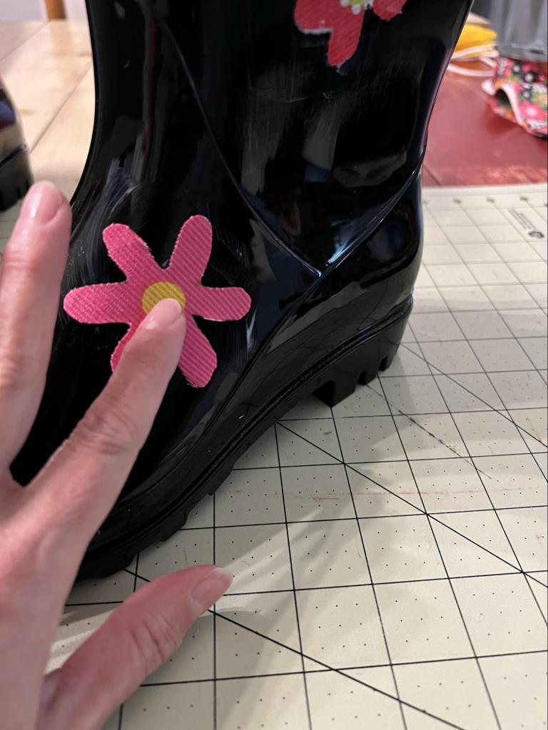 I had some cute leftover fabric from another project, so I cut out the flowers that were part of the fabric design. Using mod podge as a glue, I spread it onto the boot and positioned the flowers.