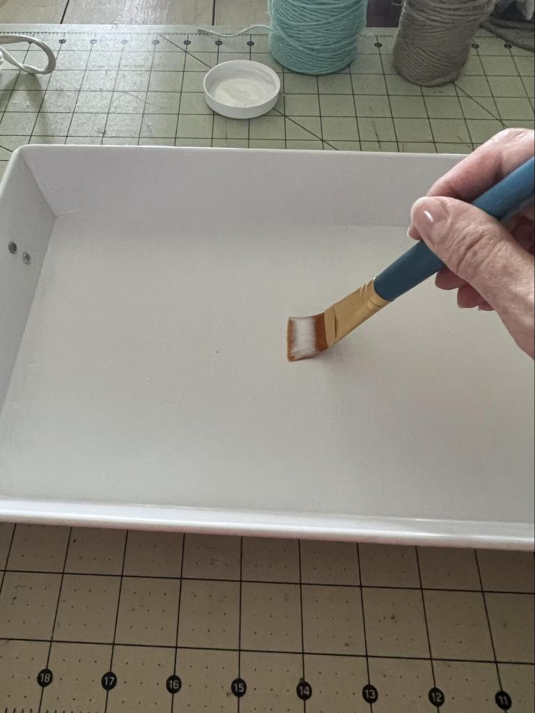 Next, I had to get my jute twine out. Using a hot glue gun, I attached it around the top and half way down the sides of the tray to break up the white color.