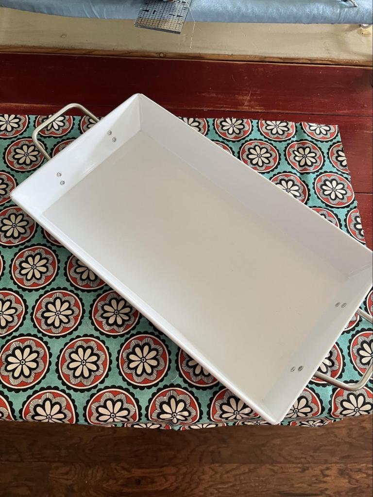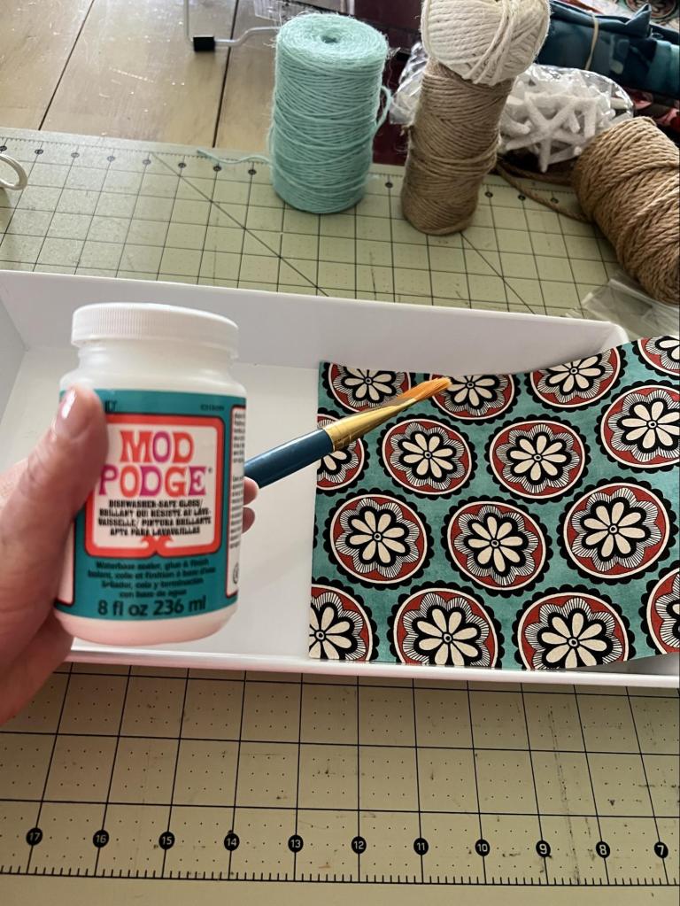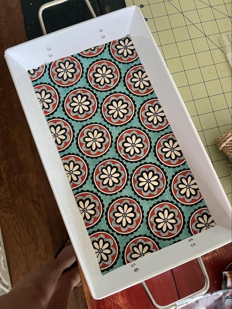 I started by finding some cute fabric in my fabric stash and cutting it to fit the inside of the tray bottom. I used Mod Podge to attach the fabric. I also applied Mod Podge to the top off the fabric to create a protectant barrier from water and dust.