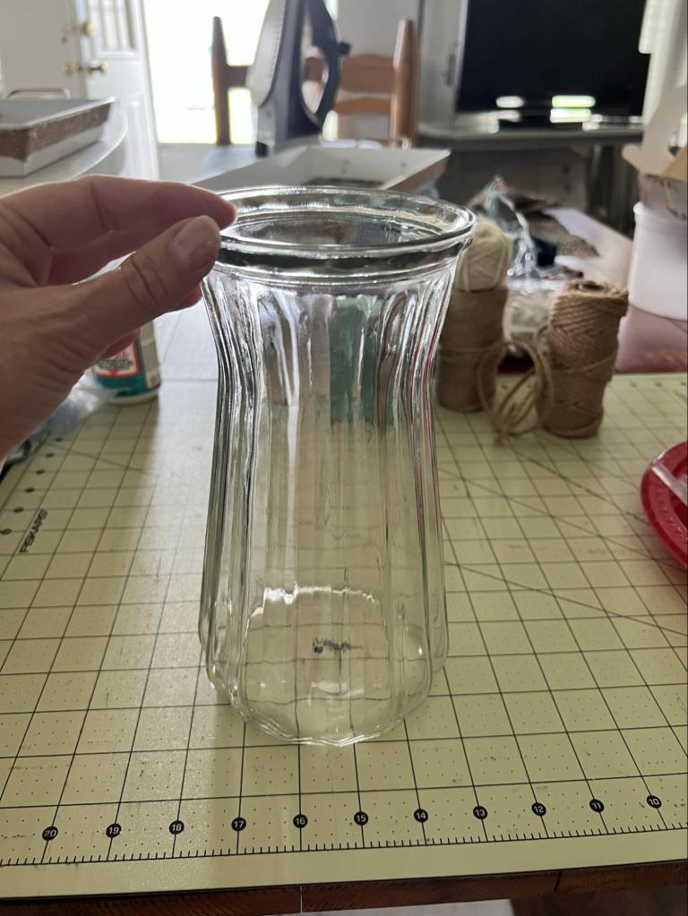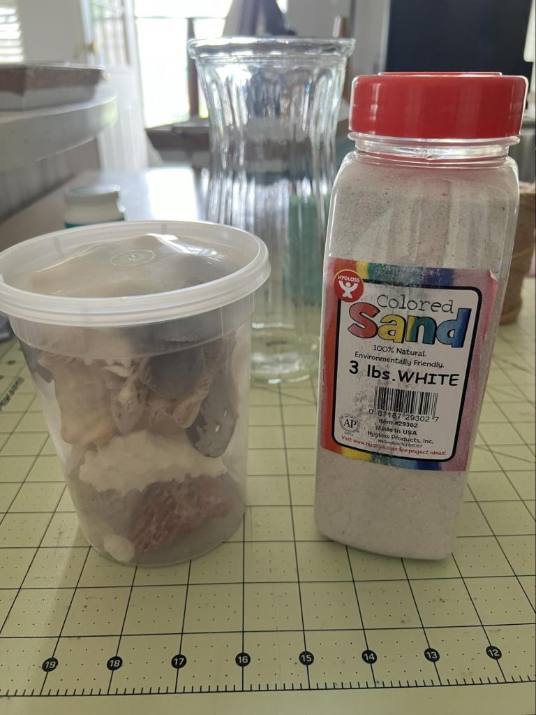I poured the sand into the vase and stacked the shells on top of the sand. I placed the vase in one of the trays, and using E6000 clear flexible glue, I attached the 2nd tray to the top of the vase.