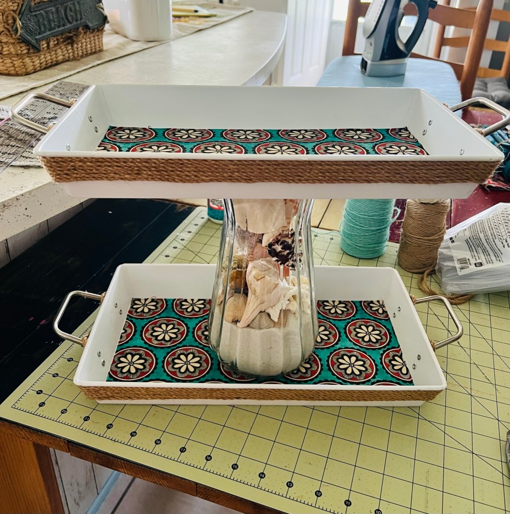 Since I had two of these trays, I decided to take it a step further by stacking one on top of the other using a glass flower vase that I found in my “vase” collection. I also had some left over craft sand and seashells from my Grandmother Lucy’s shell collection.