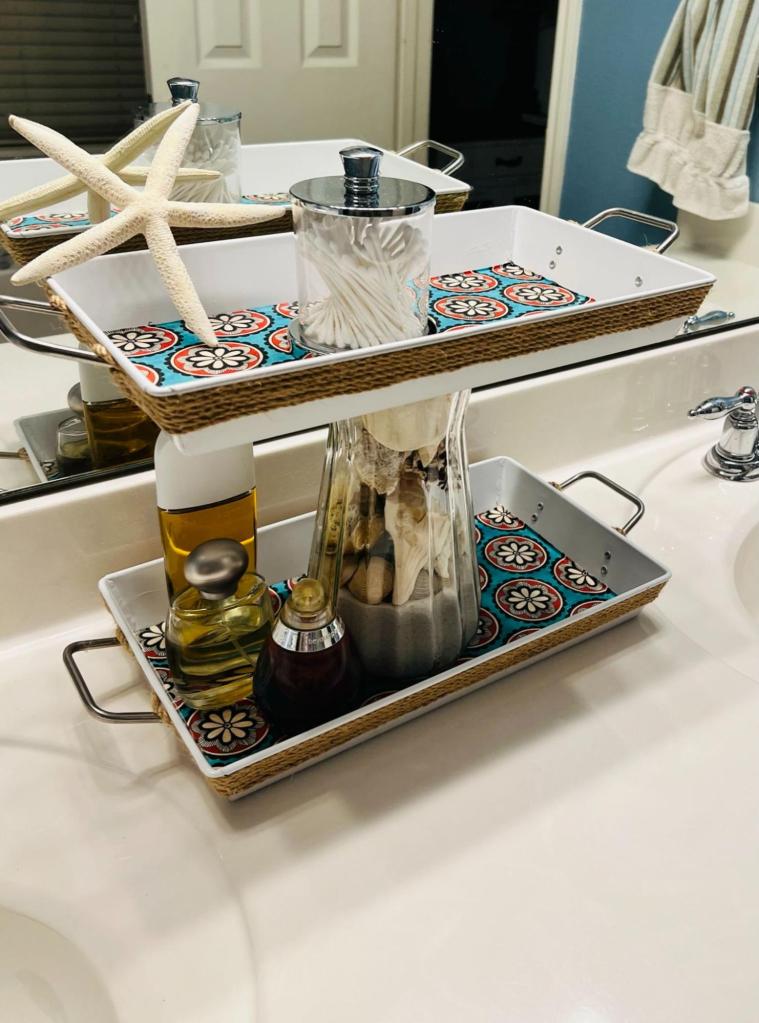 Now I have a tiered, space saving tray for my bathroom sink and vanity area.
