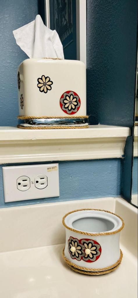 I recently updated bathroom trays to create more tiered storage on my bathroom vanity/countertop (post coming soon to show how I did it). But why stop at the trays? I have a ceramic white tissue holder and these cute white ceramic canisters that have just stayed hidden because I got tired of the look. Rather than give them away or trash them, I thought I would add a little color and beach flare.