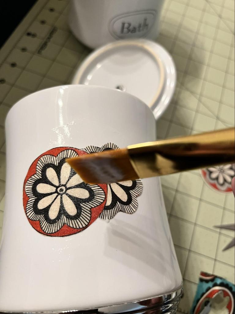 I applied the Mod Podge to the containers first so that I could place the cut out designs on them and they would stick in place.