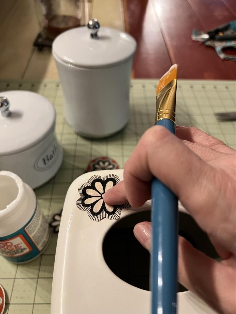 I took the same fabric I used to update the bathroom trays and cut the little designs out so that I could apply them with mod podge onto the tissue holder and canisters.