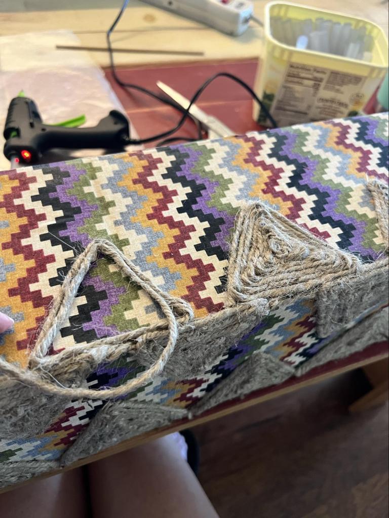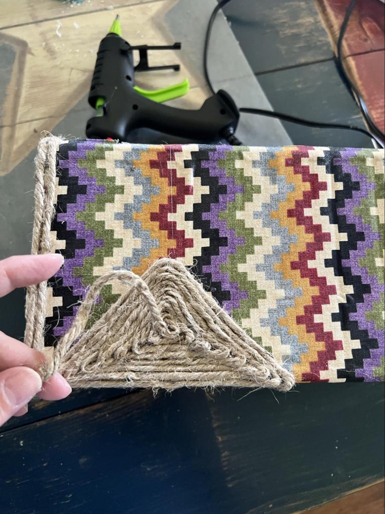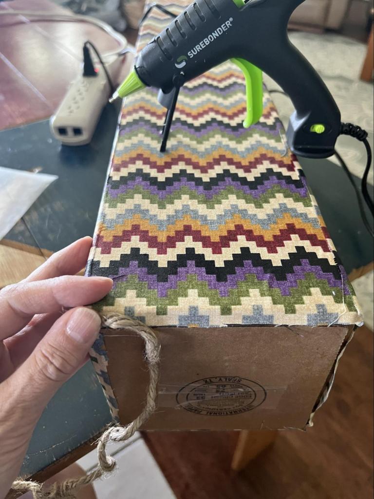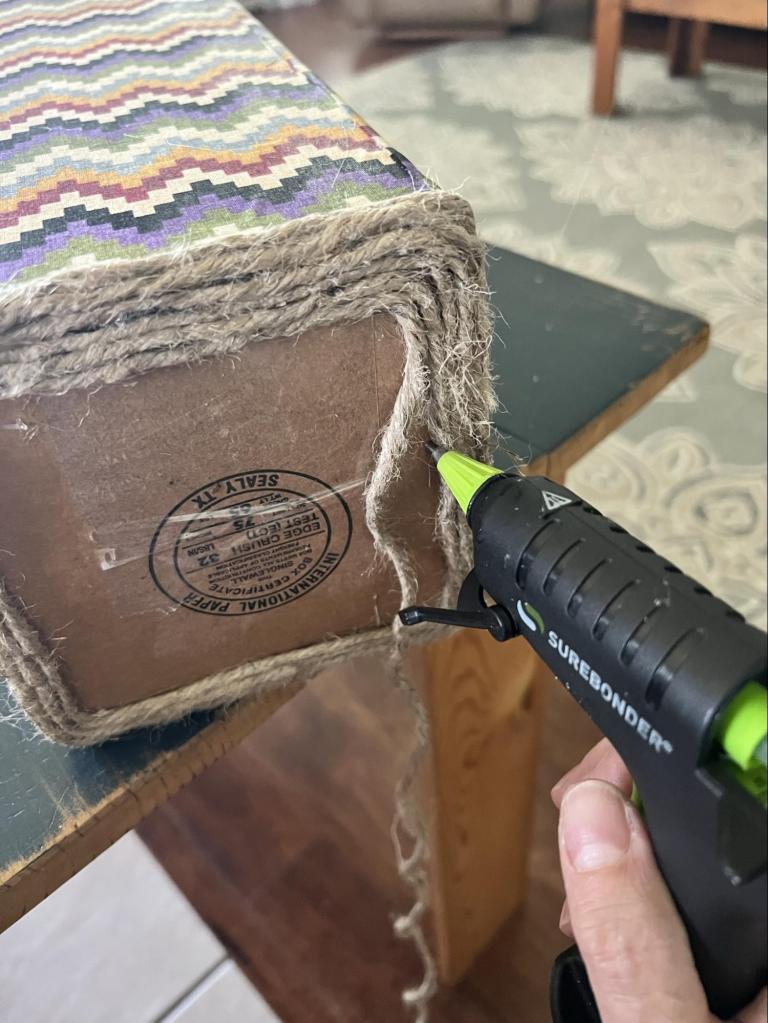 Once the box had dried, I applied jute twine using a hot glue gun.
