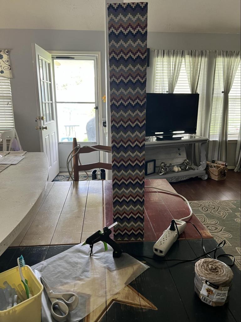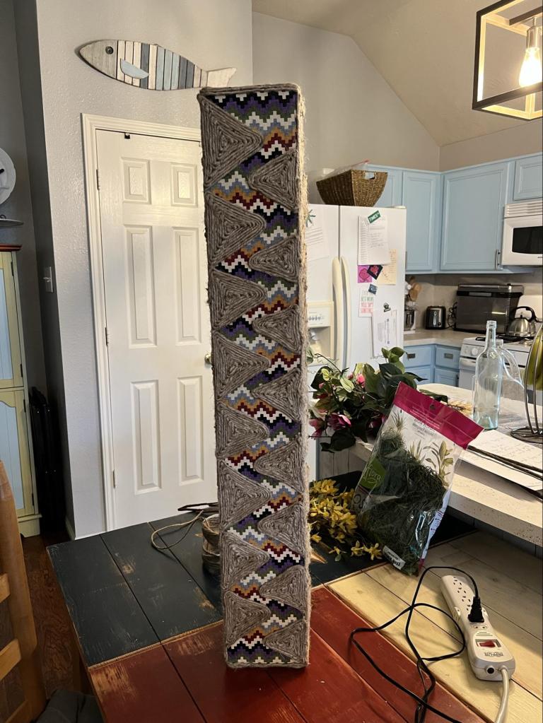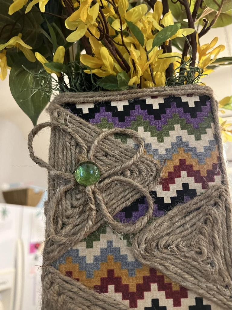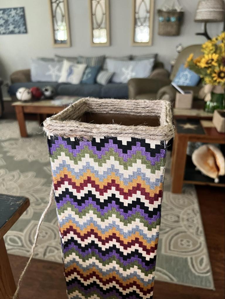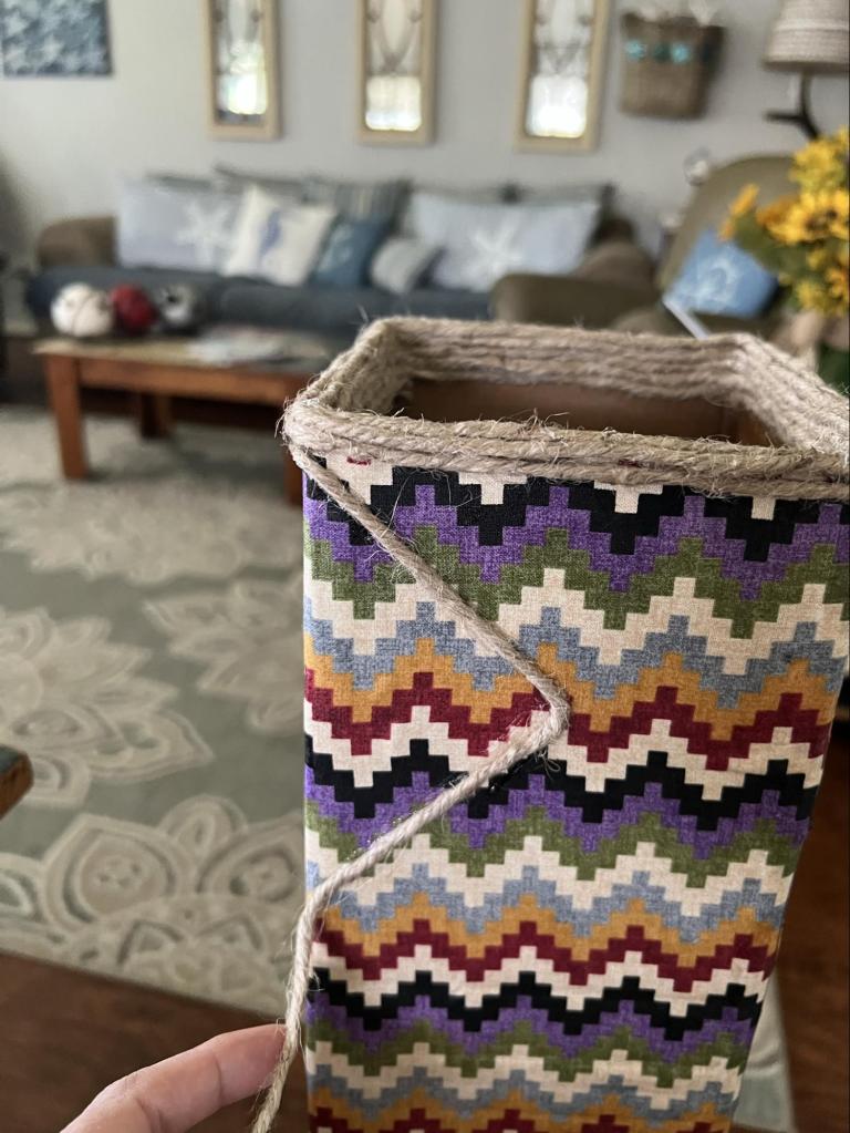 Once the box had dried, I applied jute twine using a hot glue gun.