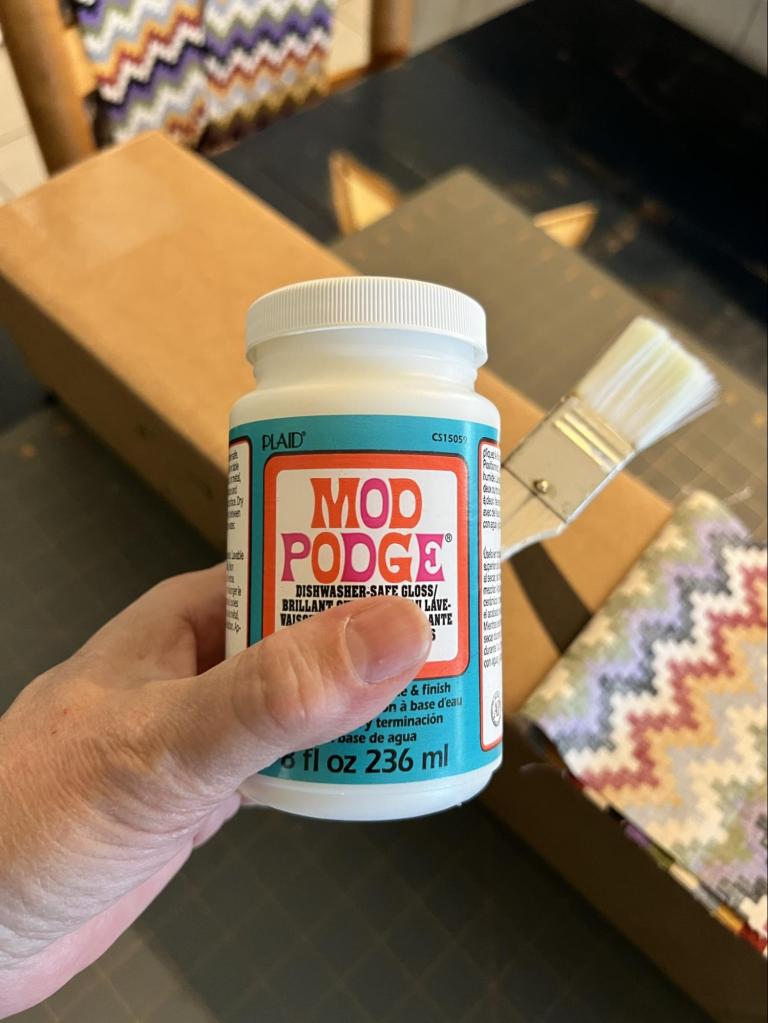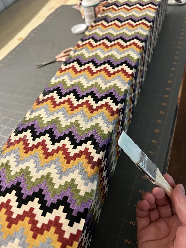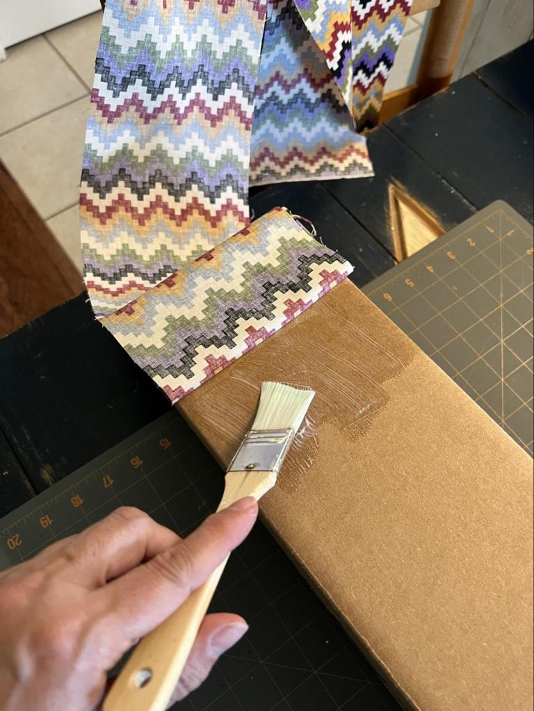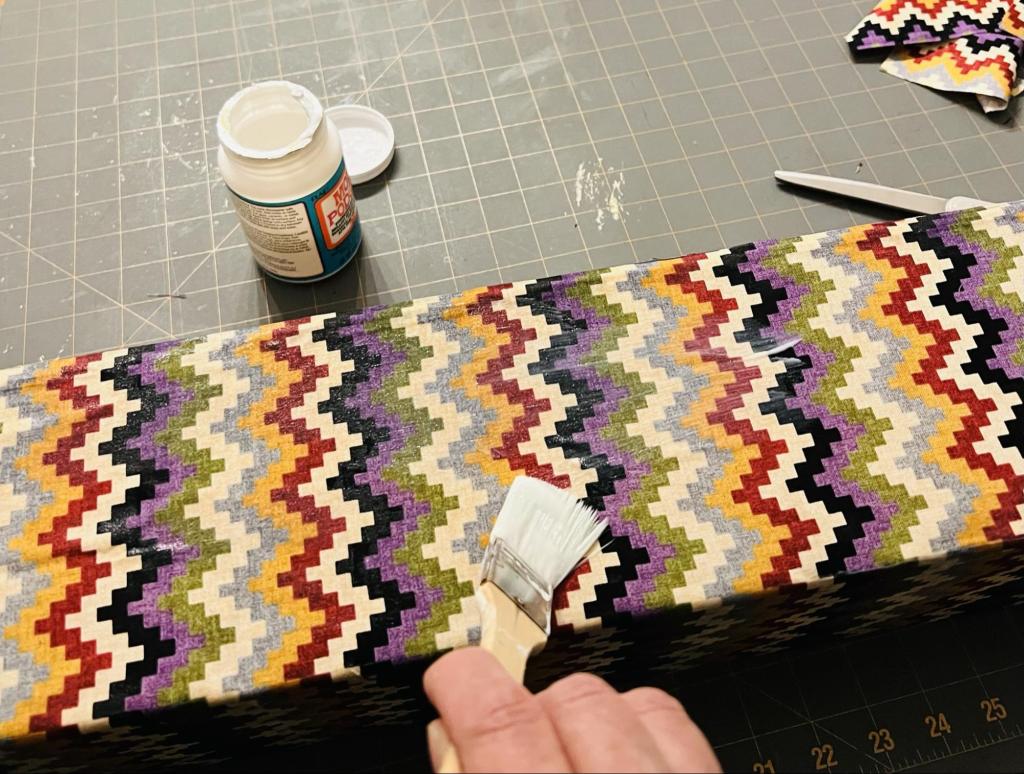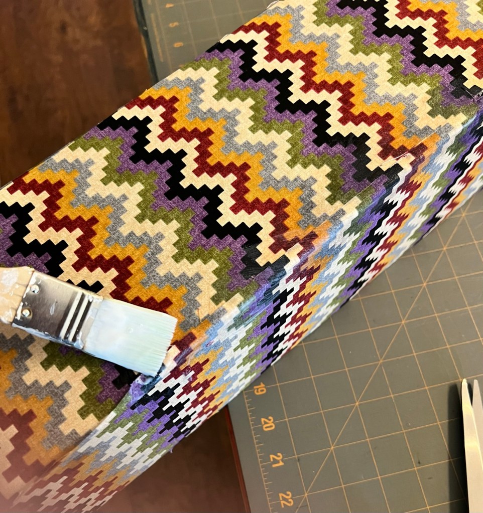 To apply the fabric to the box, I used Mod Podge and a brush to apply and then gradually laid the fabric on top of the Mod Podge, smoothing it out as I went.