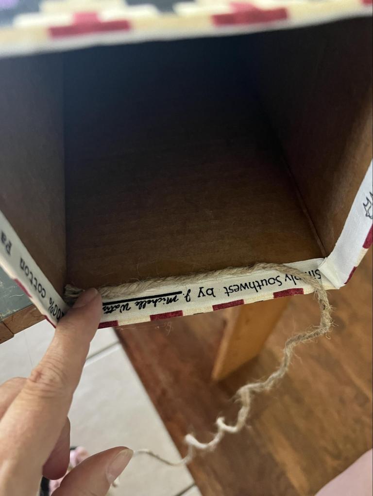 Next I wrapped the twine around the top opening of the box, starting on the inside of the opening and securing it with hot glue.