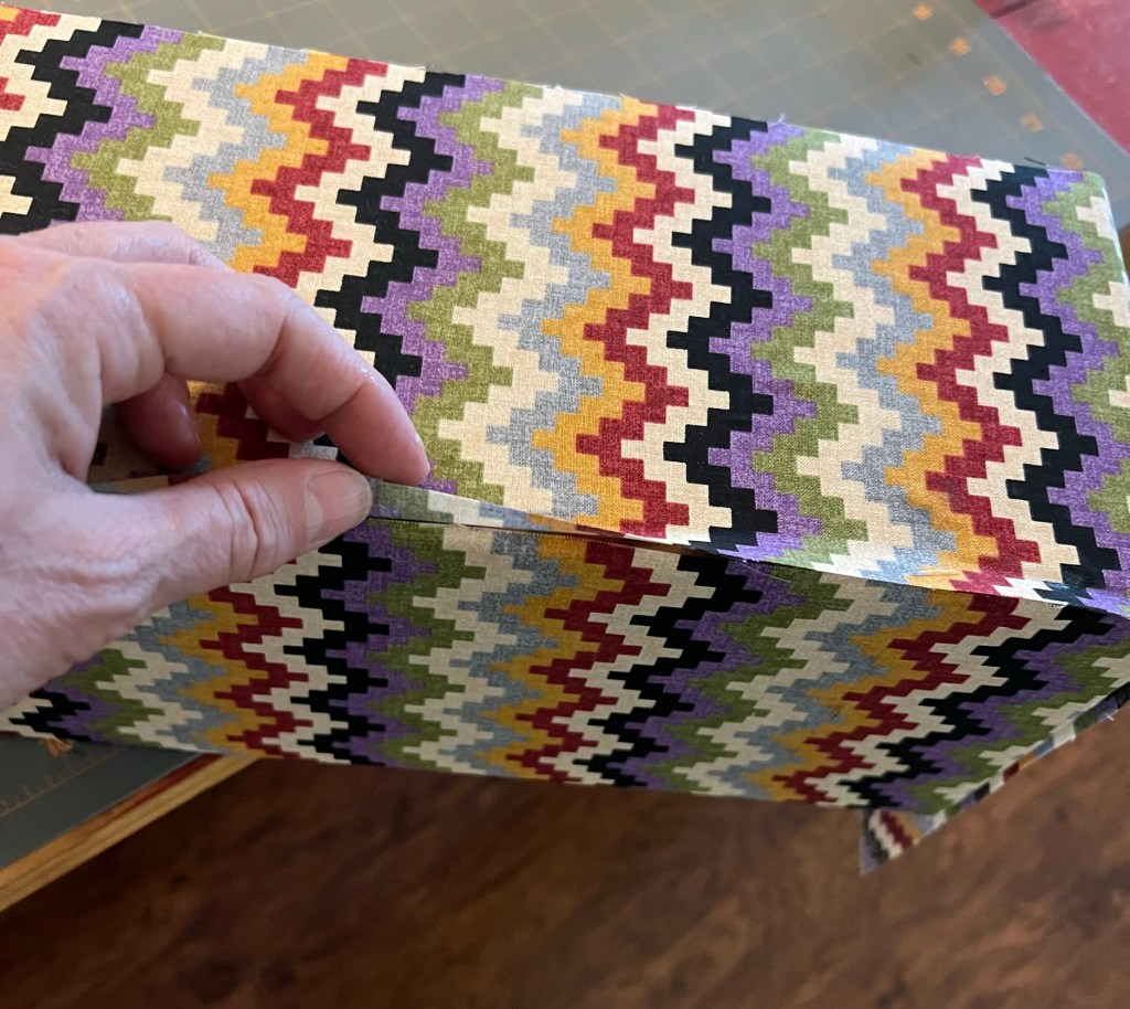As I covered all 4 sides (leaving the bottom of the box uncovered and folding the fabric panel inside the opening of the box), I applied 2 layers of Mod Podge all over the 4 sides, letting it dry between coats. I sealed the raw edges on each of the sides with the Mod Podge.