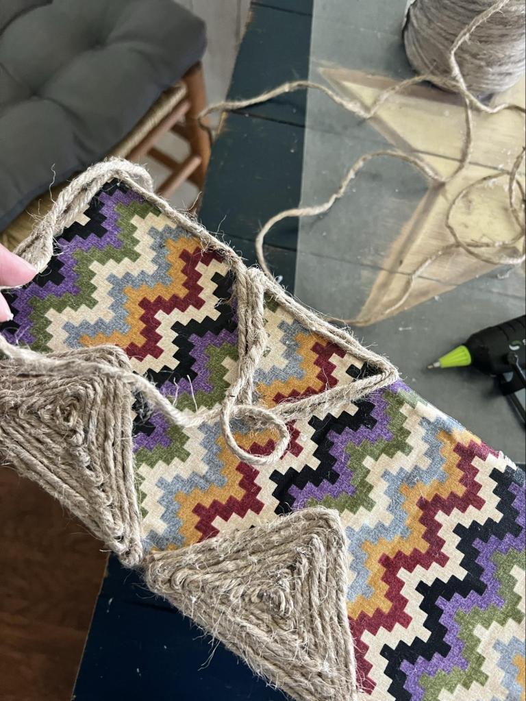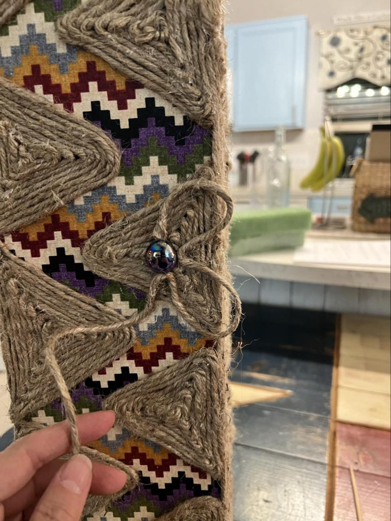 Now it was time for a design. I must admit this took me a long time, a lot of twine and a lot of glue sticks! I used a toothbrush between application of twine to brush and remove excess glue globs and webs from the twine and fabric.